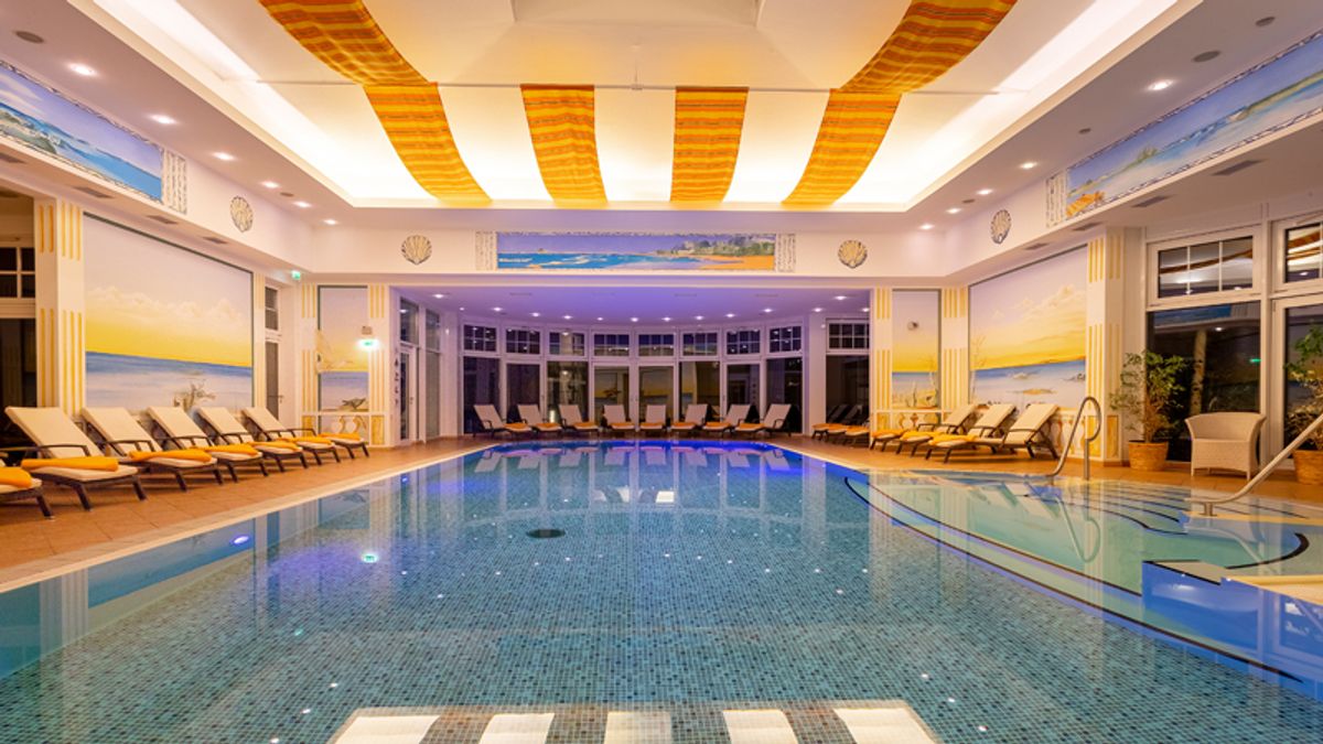 Der Wellnessbereich im SEETELHOTEL Ostseehotel Ahlbeck ist ein Ort zum Entspannen. Er umfasst einen Innenpool, eine Sauna und einen Ruheraum.